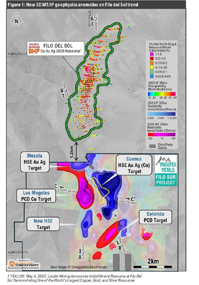 Das Vorkommen von edelmetallhaltigen, durch Quarz-Alunit alterierten Brekzien, die das Meseta-Plateau umranden, mit einer darunter liegenden resistiven, trichterförmigen MT/ IP-Anomalie, erinnert an die Situation vor der Entdeckung von HSE-Brekzienlagerstätten wie den Goldfields Salares Norte(3) und Barrak Gold Alturas(4) Brekzienlagerstätten mit HSE-Au-Ag-Vorkommen, die sich entlang der Segmente El Indio und Marracunga des miotischen Mineralgürtels befinden, in dem auch die Lagerstätte Filo Del Sol liegt.
