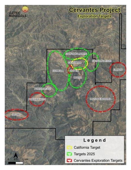 Aztec hat nun eine erste Phase seines Oberflächenexplorationsprogramms von 2025 abgeschlossen. Diese bestand aus Erkundungsprobenahmen an Ausbissen und geologischer Kartierung mehrerer Ziele auf dem 3.649 Hektar großen, zu 100 Prozent dem Unternehmen gehörenden Konzessionsgebiet. Das Programm konzentrierte sich sowohl auf drei Goldmineralisierungszielgebiete mit hoher Priorität in den Zielen California East, California North und Brasil als auch auf weitere Arbeiten in anderen angrenzenden Gebieten des Projekts Cervantes (siehe Abbildung 1 unten).