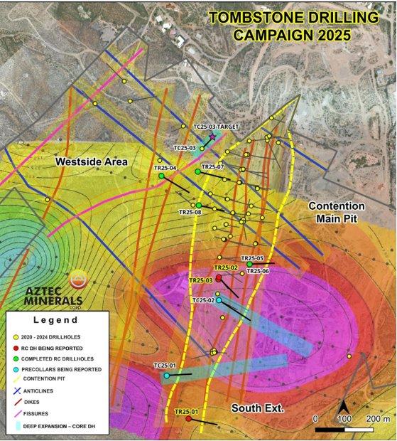 Aztec Minerals Corp. (AZT: TSX-V, OTCQB: AZZTF) („Aztec“ oder das „Unternehmen“) gibt den Erhalt von Ergebnissen aus den ersten 5 Bohrlöchern der RC-Bohrungen aus seinem Bohrprogramm 2025 in der Liegenschaft Tombstone im südöstlichen Arizona bekannt. Das Unternehmen berichtete weiterhin, dass eine zweite Bohranlage (Kern) in das Projekt mobilisiert wurde und mit Bohrprüfungen tiefer, unter der Liegenschaft gelegener Ziele der Karbonatverdrängung („CRD“) begann.