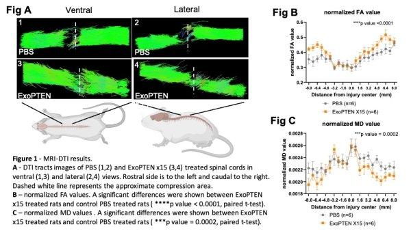 Eine bildgebungsbasierte Analyse von Tieren, die nach einer Rückenmarksverletzung mit ExoPTEN behandelt wurden, zeigte stärker organisiertes Rückenmarksgewebe im Vergleich zu unbehandelten Kontrollen. Eine funktionelle Bewertung derselben Kohorte, die zeigte, dass 100 % der Tiere in einer Hochdosisgruppe die motorische Funktion wiedererlangten, wurde im Juli 2025 veröffentlicht.