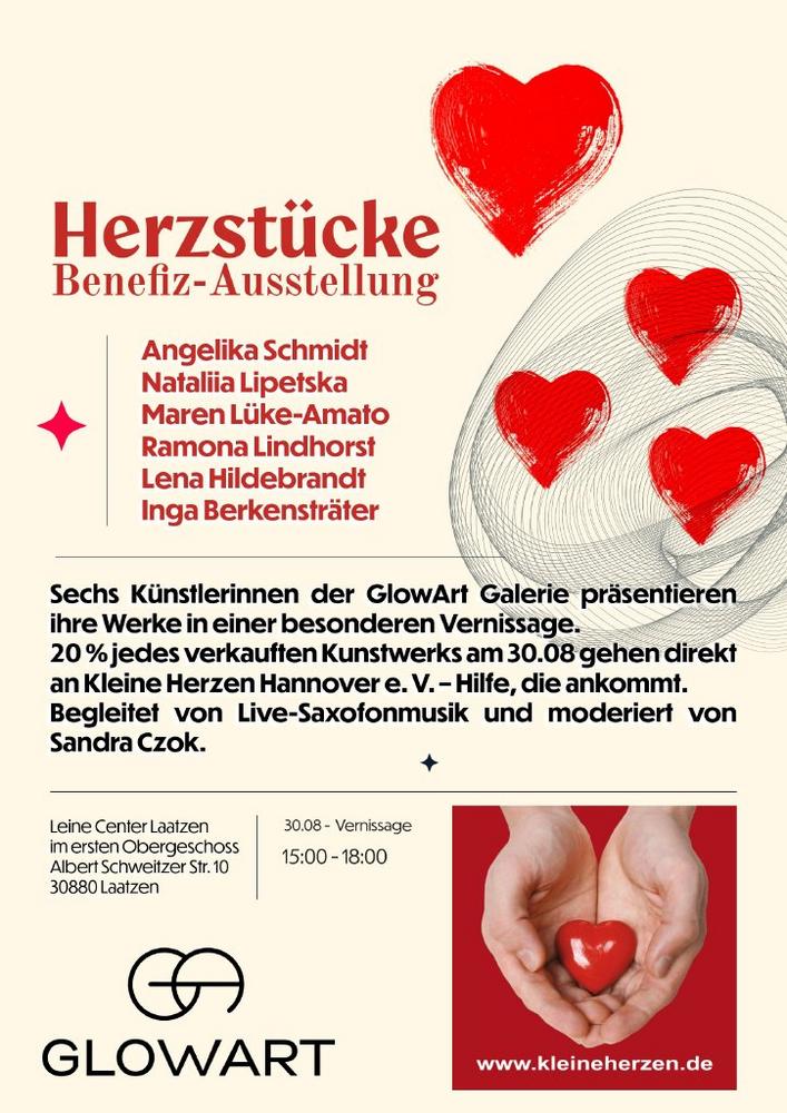 Die GlowArt Galerie lädt von 15:00 bis 18:00 Uhr zu einer besonderen Vernissage unter dem Motto „Herzstücke“ in das Leine Center Laatzen ein. Sechs herausragende Künstlerinnen präsentieren ihre Werke – und verbinden künstlerische Leidenschaft mit gelebter Solidarität: 20 % aller Verkaufserlöse des Tages gehen an den Verein Kleine Herzen Hannover e. V., der sich seit fast zwei Jahrzehnten für schwerkranke Kinder und ihre Familien einsetzt.