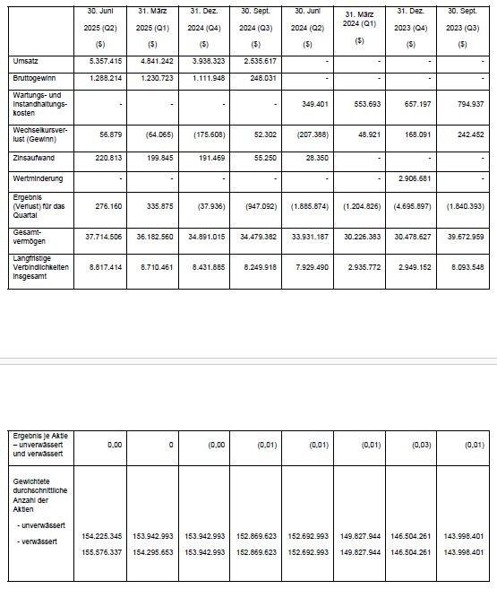 • Der Bruttogewinn belief sich im zweiten Quartal 2025 auf 1,29 Millionen Dollar (1,23 Millionen Dollar im ersten Quartal 2025).