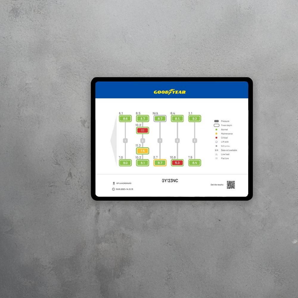 Live Display (Goodyear FleetHub): Die neuesten Reifenmessungen können in der Werkstatt einfach auf beliebigen, angeschlossenen, externen Bildschirmen, in einem neuen, übersichtlicheren Layout angezeigt werden. Diese neue Funktion ist in der Goodyear FleetHub-Webanwendung verfügbar. Damit können Techniker sofort erkennen, welche Maßnahmen zu setzen sind, und Händler können Traffic in potenzielle Interessenten umwandeln. Kunden und Interessenten wiederum können auf dem Smartphone komfortabel auf die Daten des Ergebnisbildschirms zugreifen, indem sie einen QR-Code scannen – ideal für schnelle Einblicke an Servicepunkten oder Kundenschaltern.