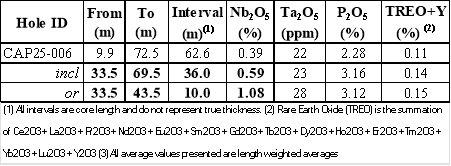 Die vorläufigen visuellen Ergebnisse aus Bohrloch CAP25-006 aus der Kampagne 2025 veranlassten das Unternehmen, beim Untersuchungslabor einen Eilauftrag für die Ergebnisse aus den oberen 72,5 Metern („m“) aufzugeben. Die Ergebnisse bestätigen eine starke Niob-Mineralisierung, die bei 33,5 m bohrlochabwärts beginnt und sich über 36 m mit 0,59 % Nb₂O₅ erstreckt, einschließlich einer höhergradigen Zone von 10 m mit einem durchschnittlichen Gehalt von 1,08 % Nb₂O₅ (siehe Tabelle 1, Abbildung 1). Diese Ergebnisse validieren die deutlichen visuellen Einschätzungen der Pyrochlor-Mineralisierung (Abbildung 2), die das Unternehmen in seiner Pressemitteilung vom 12. August veröffentlichte, und veranschaulichen das Potenzial für den Erzgehalt über eine beträchtliche Mächtigkeit in der Tiefe, wo das Zentrum des mineralisierten Systems noch nicht erkundet wurde.