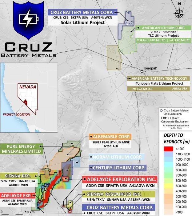 Cruz Battery Metals Corp. (CRUZ:CSE) (BKTPF:OTCID) (A40YSN:WKN) (das „Unternehmen“ oder „Cruz“) freut sich bekannt zu geben, dassdas Unternehmen seine Lithium-Claims in Nevada, die seinem 4.938 Acres großen Lithiumprojekt Solar direkt neben dem Projekt TLC von American Lithium Corp. (AMLIF – Nasdaq, LI – TSX.v) (siehe Karte unten) zugrunde liegen, verlängert hat.