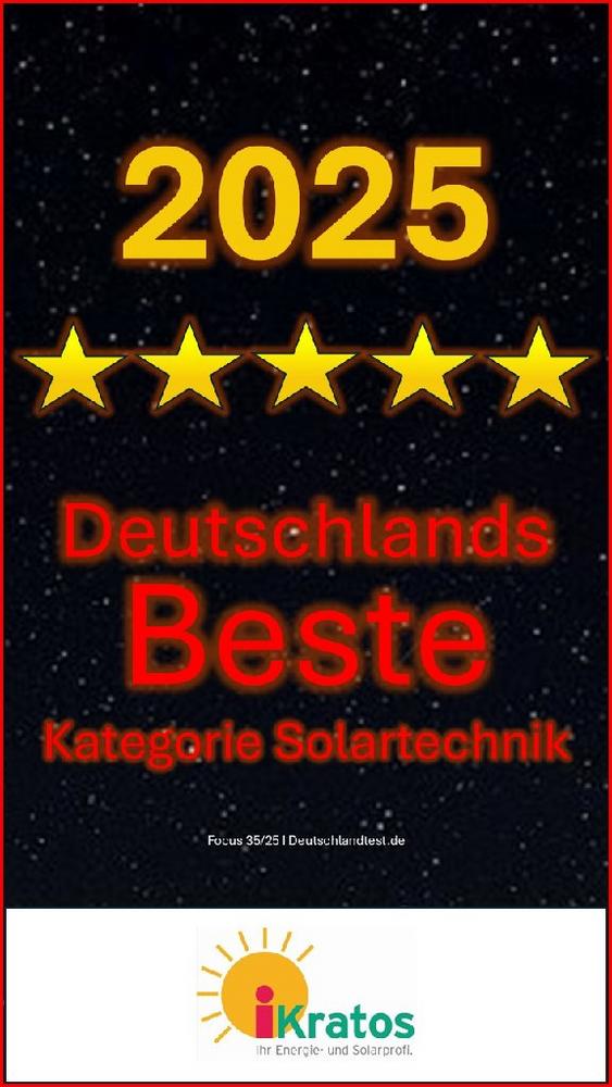 Die iKratos GmbH wurde im Rahmen der Studie "Deutschlands Beste 2025" von Focus Money und Deutschland Test in der Kategorie Solartechnik das 8.Jahr in Folge ausgezeichnet. Die Untersuchung, die in Zusammenarbeit mit ServiceValue durchgeführt wurde, basierte auf einem Social-Listening-Verfahren. Dabei wurden Online-Erwähnungen und Kundenfeedback analysiert, um Unternehmen zu identifizieren, die ein besonders positives Image haben. Die iKratos GmbH konnte in dieser Bewertung einen überdurchschnittlichen Gesamtpunktwert erzielen.