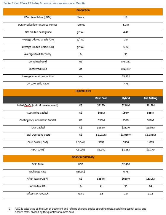 The PEA is based on the current Mineral Resource Estimate for Eau Claire with an effective date of May 10, 2024, and is reported using a gold price of US$1,900/oz (Table 2), see Eau Claire NI43-101 report titled “Mineral Resource Estimate Update for the Eau Claire Project, Eeyou Istchee James Bay Region of Quebec, Canada” dated June 25, 2024 filed under Fury’s profile on SEDAR+.