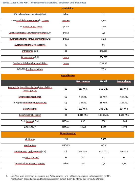 Die PEA basiert auf der aktuellen Mineralressourcenschätzung für Eau Claire mit Stichtag 10. Mai 2024 und wird unter Verwendung eines Goldpreises von 1.900 US-$ /Unze (Tabelle 2) angegeben, siehe Eau Claire NI43-101-Bericht mit dem Titel „Mineral Resource Estimate Update for the Eau Claire Project, Eeyou Istchee James Bay Region in Quebec, Kanada” vom 25. Juni 2024, der unter dem Profil von Fury auf SEDAR+ veröffentlicht wurde.