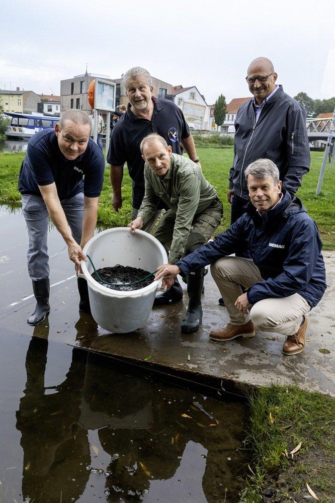 Der Landesanglerverband Mecklenburg-Vorpommern e. V. (LAV) und der Energieversorger WEMAG engagieren sich auch in diesem Jahr erneut gemeinsam für den Schutz und den Bestand des europäischen Aals. Dazu traf sich Bernd Dickau, Präsident des LAV mit WEMAG-Vorstand Caspar Baumgart und WEMAG-Vertriebsleiter Michael Hillmann in Schwaan, einer Kleinstadt im Landkreis Rostock. Dort entließen sie rund 110 Kilogramm Jungaale in die Warnow. Die angefütterten Aale wiegen jeweils rund 10 Gramm und sind 15 bis 20 Zentimeter lang. Jetzt tummeln sich etwa 15.500 Jungaale vor allem im Schilfbereich des Flusses, der in die Ostsee mündet.