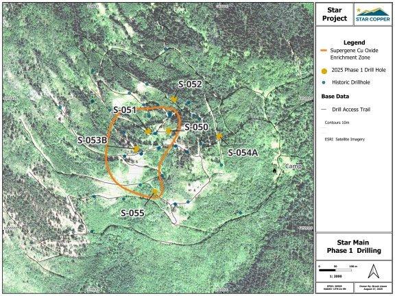 Darryl Jones, CEO des Unternehmens, merkt an: „Unser sechs Bohrlöcher umfassendes Phase-1-Bohrprogramm bestätigte erfolgreich eine Kupfermineralisierung in mehreren Intrusivphasen, verfeinerte die Modelle zur Struktur und Alteration einschließlich kalihaltiger Halos und supergener Anreicherung und erweiterte den supergenen mineralisierten Fußabdruck bei der Zone Star Main bis zu 250 m x 300 m. Mit der zunehmenden Dynamik ist die Phase 2 für Herbst 2025 geplant und wird gezielte Step-outs und tiefere Erprobungen bei Star Main verfolgen, während bei Star North und Copper Creek Explorationsbohrlöcher hinzugefügt werden, um den Kupfer-Fußabdruck zu erweitern und über das gesamte Konzessionsgebiet hinweg neues Entdeckungspotential zu erschließen. Star Copper freut sich darauf, die Ergebnisse der Phase 1 mitzuteilen und die nächste Wachstumsphase auf unserem immer faszinierenderen Projekt Star einzuleiten.“