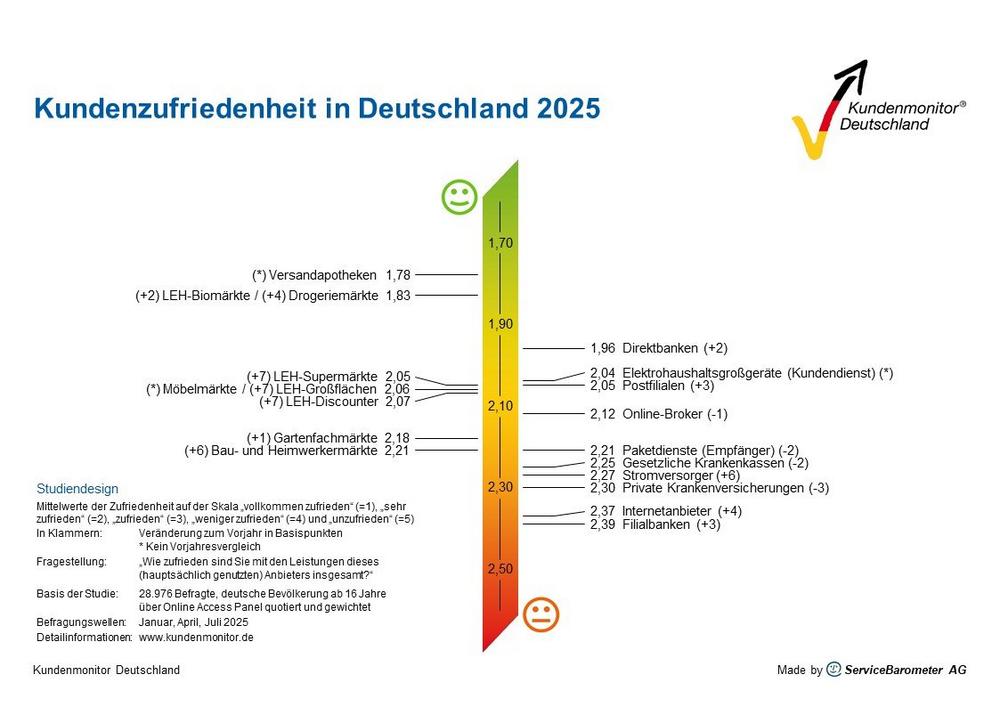 Zur Studie: Als Analysebasis für Best-Practice-Projekte von Unternehmen erhebt der Kundenmonitor Deutschland jährlich zentrale Kennzahlen zur Zufriedenheit, zu erkannten Wettbewerbsvorteilen, zur Weiterempfehlungsbereitschaft von Kunden sowie zu zentralen Verbrauchertrends. 2025 basiert die Studie auf insgesamt 28.976 Befragten (Bevölkerung ab 16 Jahre, über Online Access Panels quotiert rekrutiert und gewichtet). Die Benchmarkingreports liefern Detailergebnisse zu den ausgewiesenen Unternehmen über verschiedene Zielgruppen.