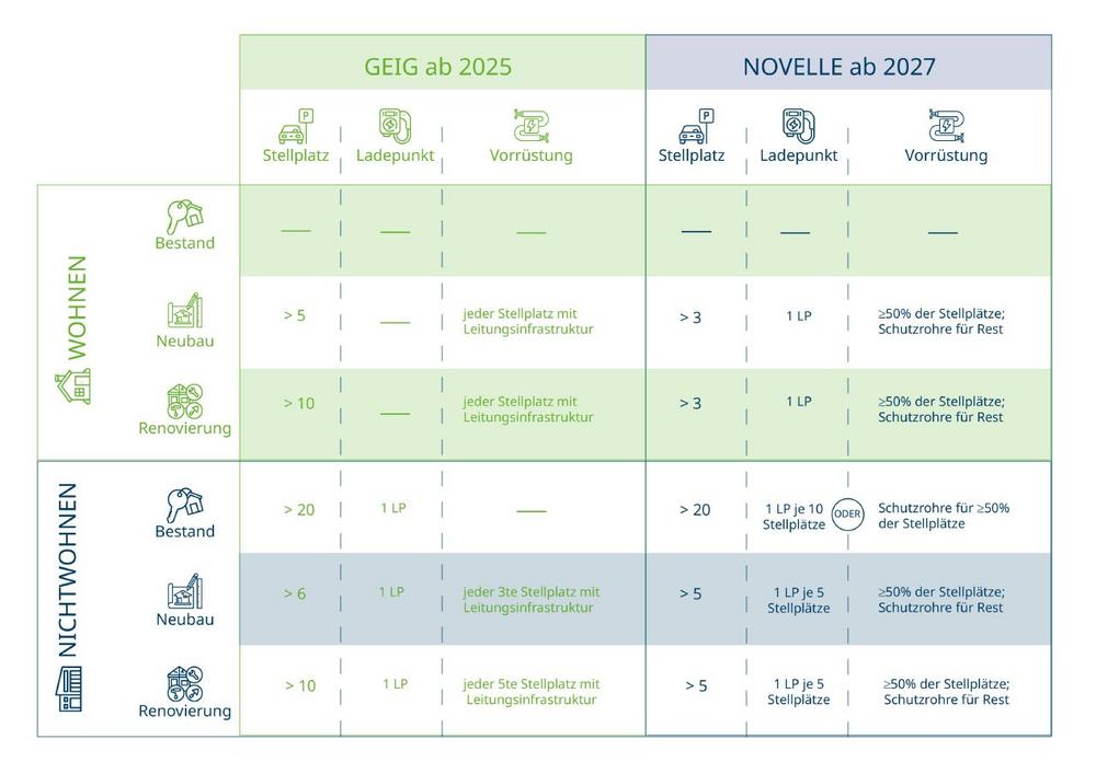 Insgesamt wurden die Anforderungen gegenüber der letzten Fassung der Gebäuderichtlinie – sowohl der EPBD als auch des davon abgeleiteten GEIG – noch einmal dahingehend verschärft, dass die Zahl der Stellplätze, ab der Maßnahmen erforderlich sind, weiter gesenkt wurde. Die konkrete Umsetzung in nationales Recht, in Gestalt einer zu erwartenden Novellierung des GEIG, bleibt abzuwarten. Hier besteht zudem die Möglichkeit, dass die Vorschriften auf Initiative des deutschen Gesetzgebers noch einmal zusätzlich verschärft werden. Bereits in der aktuell noch gültigen Fassung überschießt das GEIG die Vorgaben der EU.