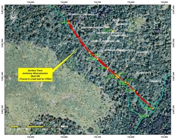 Bei den Phase-1-Bohrungen wurden insgesamt 3.150 Meter in 16 Bohrlöchern abgeschlossen. In 75 % der Bohrlöcher wurde hochgradiger antimonhaltiger Stibnit („Sb“) durchteuft – mit Werten von 4,17 % Sb über 7,4 Meter (m), 9,85 % Sb über 4,3 m, und 14,91 % Sb über 3,0 m.