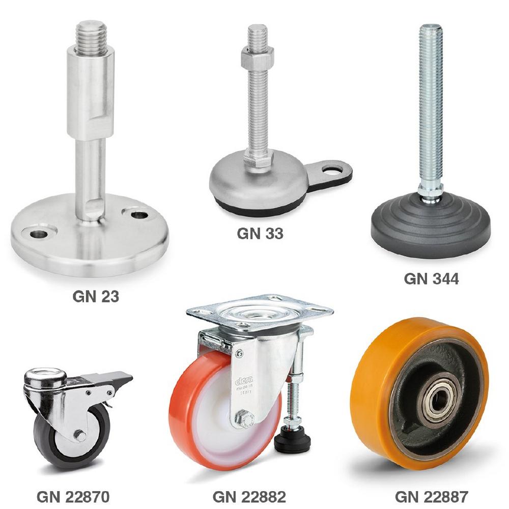 Übrigens: Auch hybride Lösungen hat Ganter im Blick. GN 22882 zum Beispiel verbindet Polyamid-Rolle und Stellfuß in einem Bauteil – was Verfahrbarkeit und maximale Standfestigkeit kombiniert. Normelemente von Ganter sind eben alles andere als einengende Standards, sondern bieten für fast alle Anforderungen zuverlässigste Lösungen.