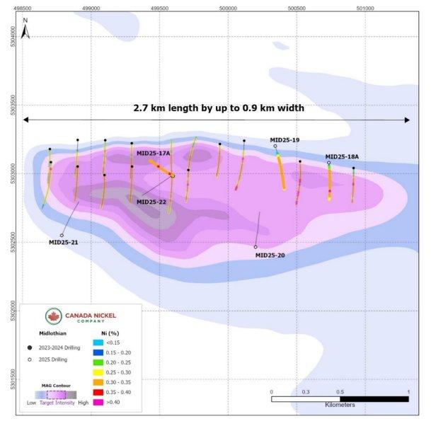 CEO Mark Selby said, “The third of our “Three Giants” continues to exceed expectations. The latest drill assays from Midlothian have delivered the most consistently higher-grade intervals we’ve seen across any of our 18 drilled properties, with the most recent three holes each returning 0.29–0.30% nickel over several hundred meters of core. With a target footprint larger than our Crawford project and shallower overburden, Midlothian is showing its potential through these results. We look forward to announcing its initial resource estimate later this year.”