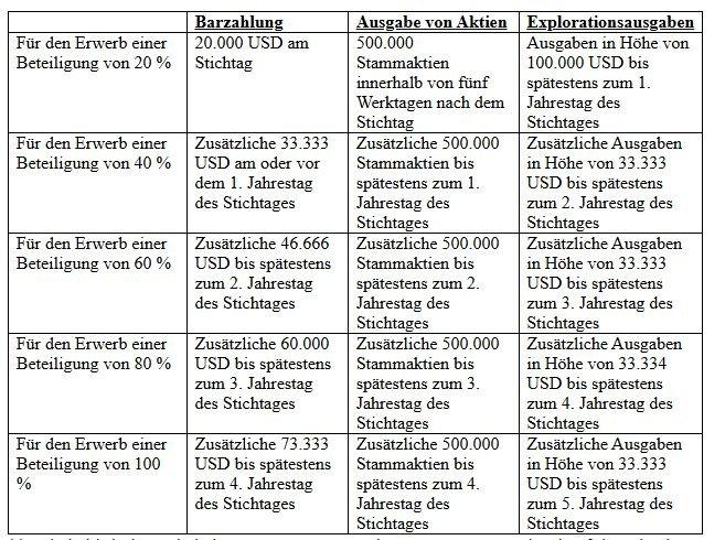 Um seine jeweiligen Anteile an den Claims Wheal Anne und Green Vein Mesa zu erwerben, müsste das Unternehmen die folgenden Barzahlungen leisten, Stammaktien ausgeben und Explorationsausgaben für die jeweiligen Claims tätigen:
