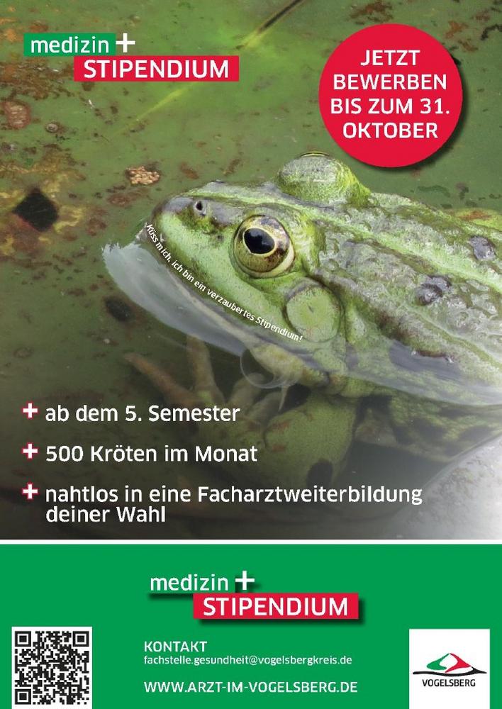 Weitere Informationen zum Stipendium, zur Bewerbung (die nächste Frist endet am 31. Oktober) und den Formalitäten auf www.arzt-im-vogelsberg.de/… oder bei der Fachstelle Gesundheitliche Versorgung unter Telefon 06641/977-1751.