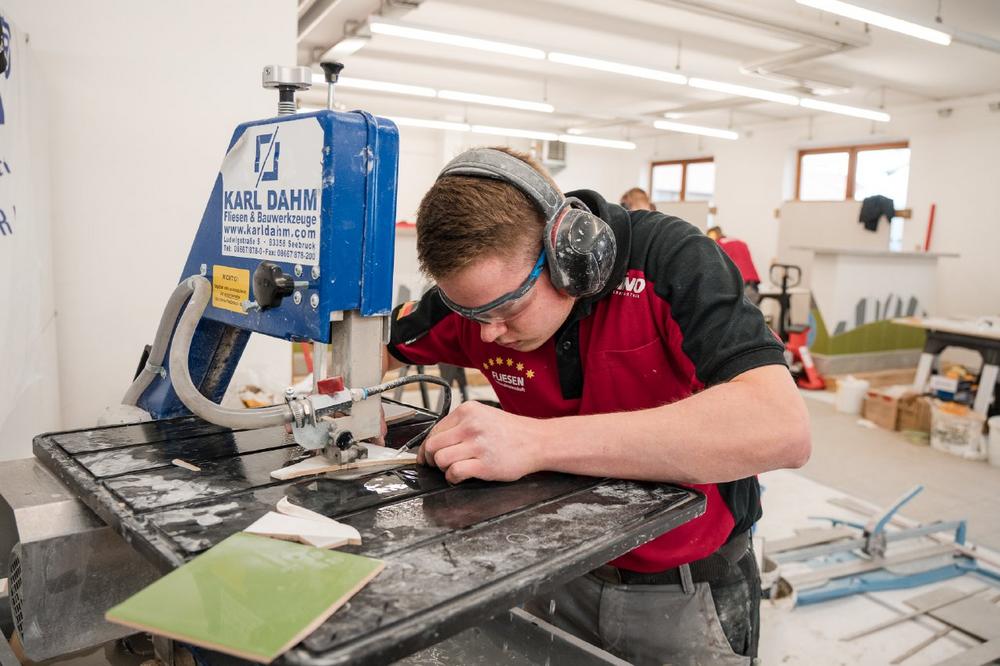 Die Fliesen-Nationalmannschaft richtet sich im Botament Schulungszentrum in Bottrop ein und stellt sich dort anspruchsvollen praktischen Aufgabenstellungen.
