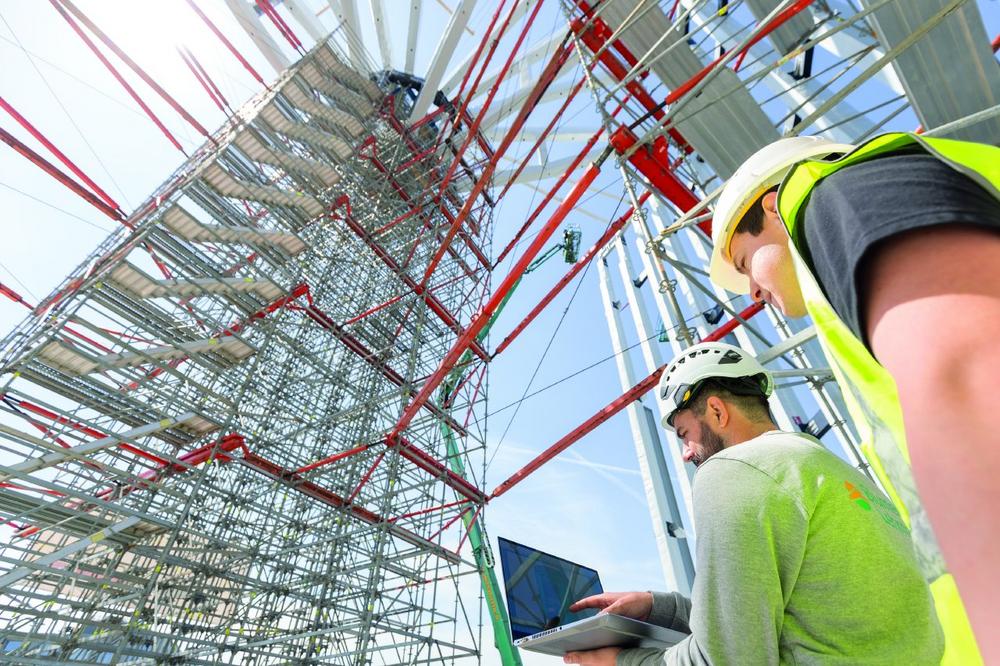 Sowohl bei Planung, Montage und Nutzung machten sich die Flexibilität und Kombinierbarkeit der beiden modularen Baukastensysteme, PERI UP und VARIOKIT, positiv bemerkbar. Beide Systeme beruhen auf einem metrischen Grundraster und lassen sich nahezu beliebig kombinieren. Zudem konnten mittels 25-cm-Riegeln ausgebildete Schwerlaststützen übergangslos integriert werden – punktgenau dort, wo innerhalb der Tragkonstruktion hohe Lastkonzentrationen abzutragen waren. Die geometrische Anpassungsfähigkeit war ebenso dort gefragt, wo auf Basis einer exakten 3D-Gerüstplanung Kollisionspunkte zwischen der Gerüstkonstruktion und dem Holzbau ausgeschlossen werden mussten.