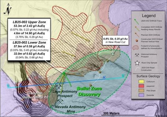 Bohrloch LB25-002, die erste Prüfung des neuen geologischen Modells von NevGold, mit einem Bohransatz in Dolomit, durchdrang die obere Überschiebungsplatte und durchteufte Gold und Antimon in mehreren Horizonten im Pilot-Schiefer. Das Ergebnis dieses Bohrlochs validiert das Modell und erweitert das Mineralisierungspotenzial entscheidend; der erhaltene Pilot-Schiefer erstreckt sich über mehr als einen Kilometer östlich früherer Bohrungen in „Resurrection Ridge“.