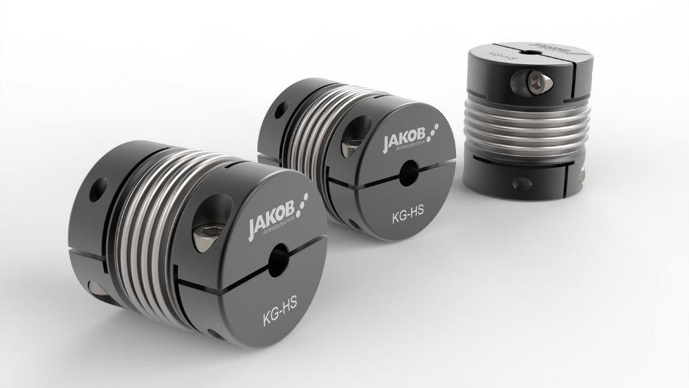 Mit der Kupplungsbaureihe KG-HS bietet JAKOB Antriebstechnik eine High-Speed Version der beliebten Metallbalgkupplung KG an. Sie wird beidseitig mit Klemmnaben in Halbschalenbauweise gefertigt.  Montage und Demontage sind so auch in beengten Einbauverhältnissen keine Schwierigkeit mehr. Die rotationssymmetrische Klemmnabe gewährleistet eine optimale Wuchtgüte, die sichere Verbindung von Balg und Naben wird mit dem Micro-Plasma-Schweißverfahren gewährleistet. Die neue Baureihe bietet Nennmomente von 5-1000 Nm bei einem Temperaturbereich von -40°C bis 350°C.