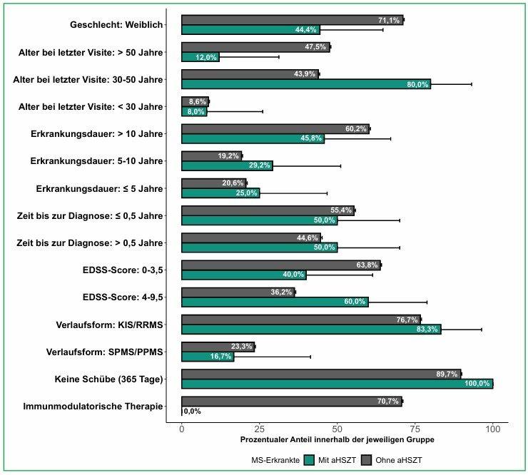 Eine erste Auswertung aus dem MS-Register (www.msregister.de) der Deutschen Multiple Sklerose Gesellschaft (DMSG) liefert nun aktuelle Einblicke zur Anwendung der aHSZT in Deutschland. Analysiert wurden erste Daten von 27 Patienten, die nach einer Stammzelltransplantation nach einem Abgleich mit dem Deutschen Register für Stammzelltransplantationen (DRST)1 im MS-Register dokumentiert sind, im Vergleich zu rund 51.000 MS-Erkrankten ohne diesen Eingriff. Die Auswertung zeigt: Personen mit aHSZT sind im Durchschnitt jünger, leben kürzer mit der Erkrankung, weisen aber häufiger einen höheren Behinderungsgrad auf. Nach der Transplantation wurde bei keiner der erfassten Personen eine Wiederaufnahme einer verlaufsmodifizierenden Therapie dokumentiert.