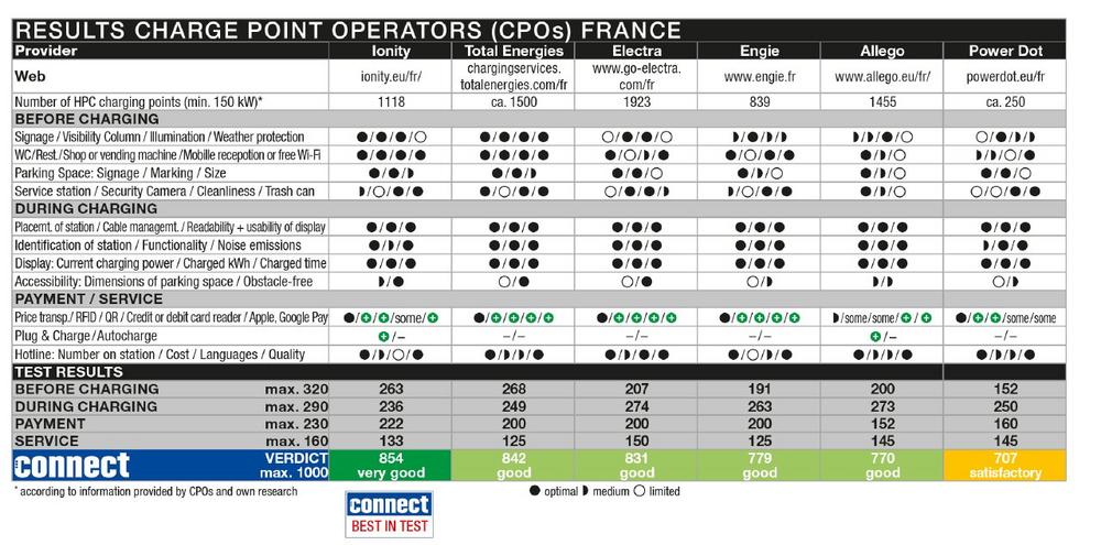 The media brand connect has once again conducted a comprehensive charging network test in France. The six charge point operators (CPOs) Allego, Electra, Engie, Ionity, Power Dot and Total Energies were evaluated in terms of user experience and charging quality. The result: Ionity is the test winner, followed by Total Energies in second place and Electra in third place.