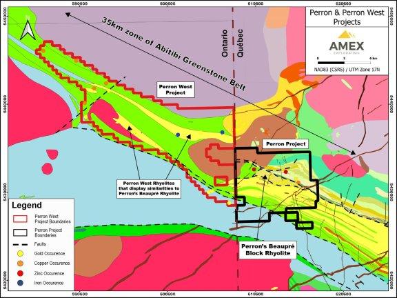 Amex Exploration Inc. hat beim zu 100 % unternehmenseigenen Projekt Perron, das sich etwa 110 Kilometer nördlich von Rouyn-Noranda in Quebec befindet, bedeutsame hochgradige Goldvorkommen sowie kupferreiche vulkanogene Massivsulfid- (VMS)-Zonen entdeckt. Das Projekt Perron besteht aus 183 zusammenhängenden Claims mit einer Fläche von 65,75 km2. Das Projekt beherbergt sowohl umfassende als auch hochgradige Goldmineralisierungsarten.