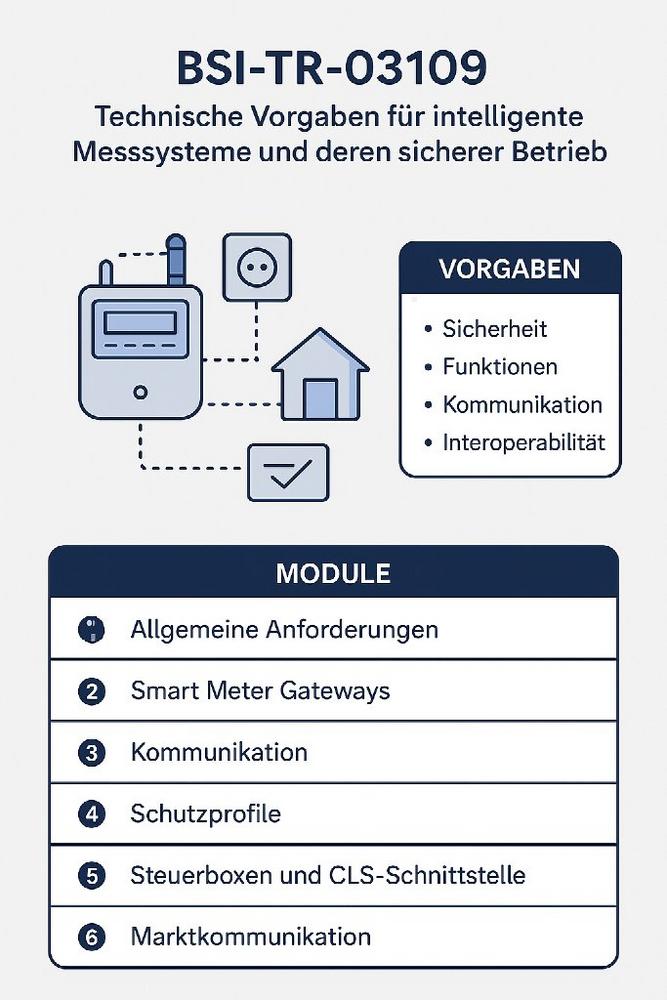 Die BSI-TR-03109 ist die maßgebliche technische Richtlinie für den Betrieb intelligenter Messsysteme in Deutschland. Sie legt die Sicherheits-, Funktions- und Kommunikationsanforderungen für alle Komponenten der Smart-Meter-Infrastruktur fest: