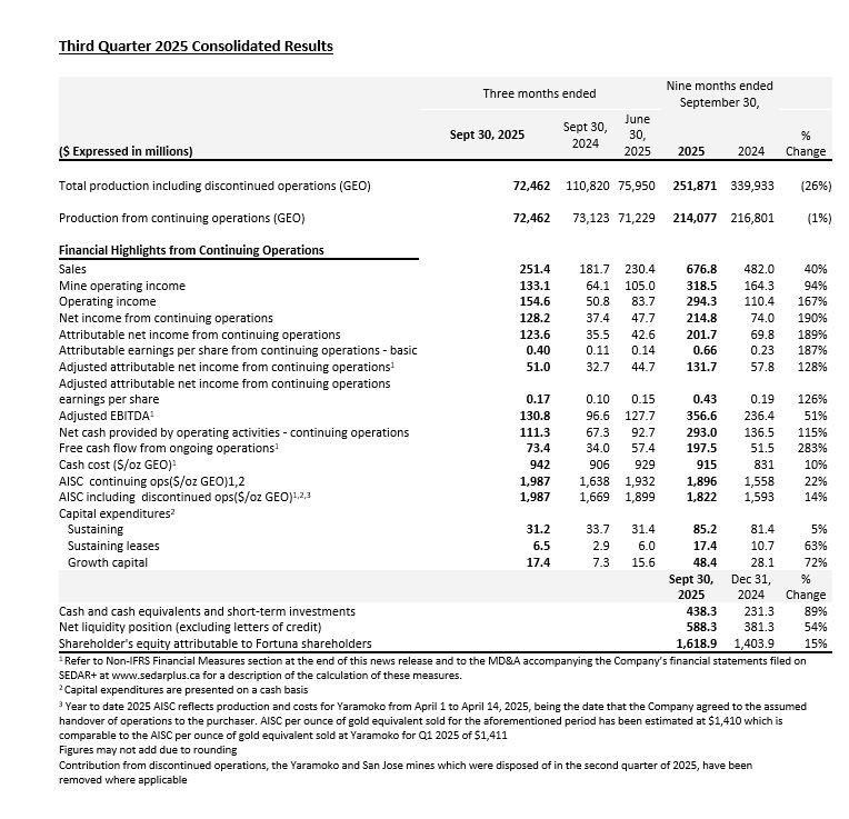 Fortuna Reports Results for the Third Quarter of 2025