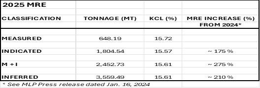 Die MRE-Werte für 2025 entsprechen etwa 102 Millionen Tonnen enthaltenem KCl in der Kategorie „gemessen“, etwa 281 Millionen Tonnen enthaltenem KCl in der Kategorie „angezeigt“ und etwa 555 Millionen Tonnen enthaltenem KCl in der Kategorie „abgeleitet“ (siehe Tabellen 3, 4 und 5). Darüber hinaus hat MLP im Vergleich zur MRE 2024 eine große erste gemessene Mineralressource von 648 Millionen Tonnen mit 15,7 % KCl hinzugefügt (siehe MLP-Pressemitteilung vom 16. Januar 2024).