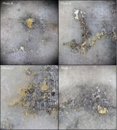 In einer Tiefe von 287,32 m unterhalb der intensivsten, weit verbreiteten Alteration und Mineralisierung wurde im Rahmen der Bohrungen ein unregelmäßiger Quarzerzgang mit geringem Neigungswinkel (10 bis 30° zur Kernachse) und einer Mächtigkeit von etwa 10 cm durchschnitten, der sichtbares Gold und Bismuthinit sowie disseminierten bis halbmassiven Pyrrhotin, Pyrit, Chalkopyrit, Arsenopyrit, Molybdänit und Sphalerit beherbergt (Fotos 1, 2 & 5). Die Kernprobenahmen des Quarzerzgangs ergaben 1,25 m mit einem Gehalt von 105 g/t Gold. Unmittelbar vor dieser Probe wurde aus einem zweiten Quarzgang mit einer Mächtigkeit im Zentimeterbereich sichtbares Gold innerhalb einer Zone aus alteriertem und gemasertem Granodiorit angetroffen (8,85 g/t Gold auf 1,15 m).Im Liegenden der mit grobkörnigem Gold angereicherten Erzgänge wurde in einem 0,75 m breiten Abschnitt (288,50 m – 289,15 m Tiefe) ein Goldgehalt von 0,47 g/t ermittelt.