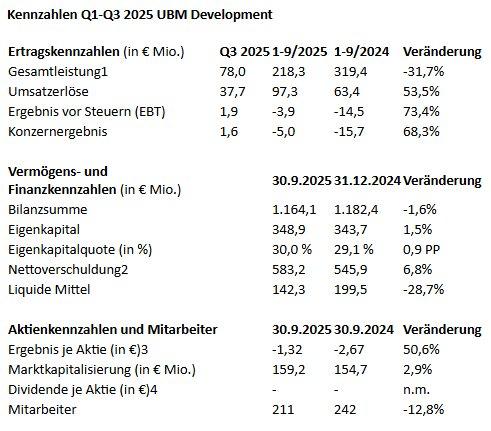 In den ersten drei Quartalen 2025 erwirtschaftete die UBM-Umsatzerlöse von € 97,3 Mio. nach € 63,4 Mio. in der Vergleichsperiode des Vorjahres. Das Ergebnis vor Ertragssteuern (EBT) verbesserte sich mit € -3,9 Mio. gegenüber der Vorjahresperiode mit € -14,5 Mio., weil sich hier noch die Verluste des ersten Quartals widerspiegeln. Das aus dem Konzernergebnis abgeleitete Ergebnis je Aktie verbesserte sich rund um die Hälfte – von € -2,67 in den ersten drei Quartalen 2024 auf € -1,32.