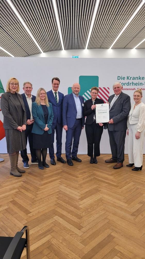 Aufsichtsratsvorsitzende Marion Gutsche sowie die Geschäftsführung Thorsten Celary (Vorsitzender) und Dr. Silke Kühnle, wurden am 28. November 2025 zur Übergabe der Förderbescheide im Rahmen der Umsetzung der Krankenhausplanung Nordrhein-Westfalen von Ministerpräsident Hendrik Wüst und Minister Karl-Josef Laumann in die Staatskanzlei eingeladen.