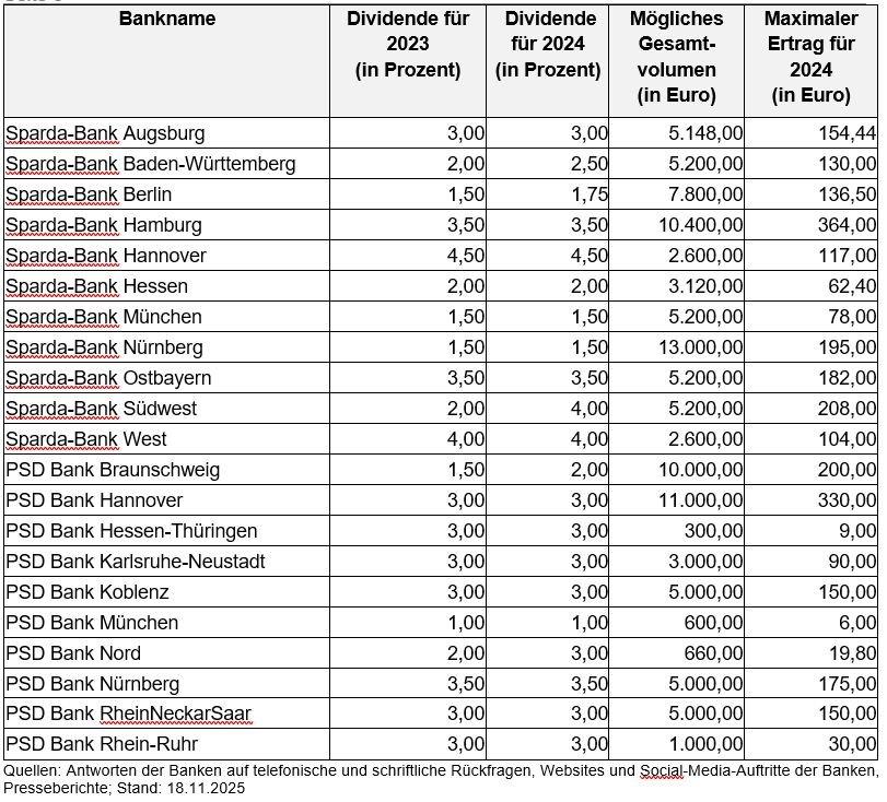 In der nachfolgenden Übersicht präsentieren wir die Dividenden der Sparda- und PSD-Banken in Prozent, das maximale Investitionsvolumen und den maximalen Ertrag, der für 2024 möglich gewesen ist.