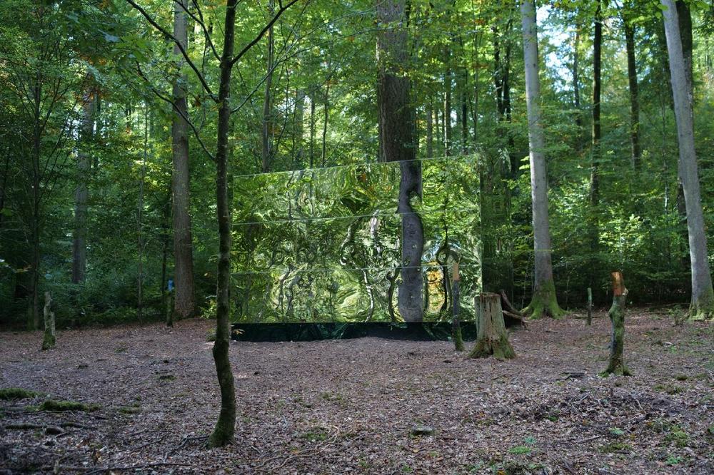 Großformatige Siebdruckmalereien auf Leinwand, alle mit dem gleichen Motiv einer Waldlandschaft, hängen an eigens für die Ausstellung gezimmerten Wänden. Sie stehen im direkten Dialog mit „Spiegelbildern“ und skulpturalen Formen aus Edelstahl – teils geschwungen und stets in spiegelnder Reflexion, umspielt von farbigem Licht und Klängen aus Erinnerungen.