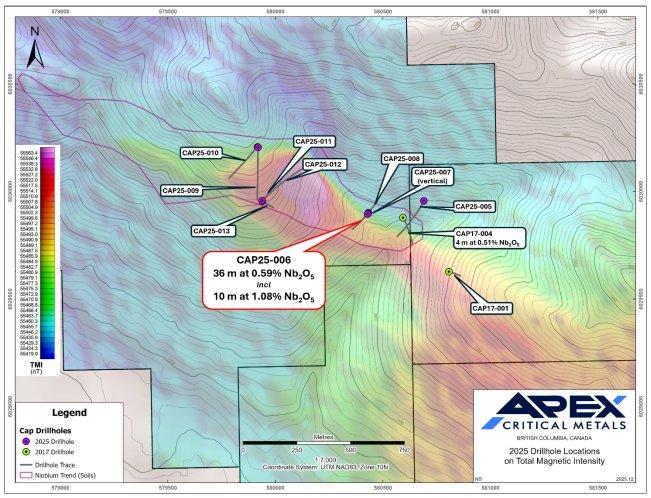 Sean Charland, CEO von Apex Critical Metals, merkte dazu wie folgt an: „Das Highlight des Bohrprogramms 2025 bleibt die oberflächennahe hochgradige Niob-Entdeckung, wobei die zusätzlichen Untersuchungsergebnisse einen breiteren Abschnitt in CAP25-006 und weitere Niob-, Phosphat- und REE-Mineralisierungen in anderen regionalen Zielgebieten zeigen, was unsere Interpretation eines großen, ergiebigen Karbonatitsystems bekräftigt. Wir sind gleichermaßen begeistert von der Intensität und dem Ausmaß der unerforschten magnetischen Anomalie südöstlich unseres regionalen Programms 2025, die die Chancen und das Explorationspotenzial von Cap unterstreichen.“