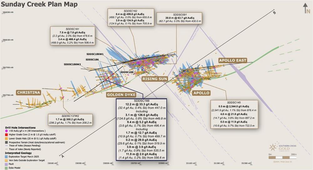 "Importantly, the drilling has now linked Golden Dyke and Rising Sun together, demonstrating these are part of the same large-scale mineralized system. To date, Golden Dyke has been defined with confidence to 600 m below surface, with considerable exploration upside remaining at depth. The consistent high-grade intercepts and robust continuity we’re seeing reinforce Sunday Creek’s position as a globally significant gold-antimony discovery."