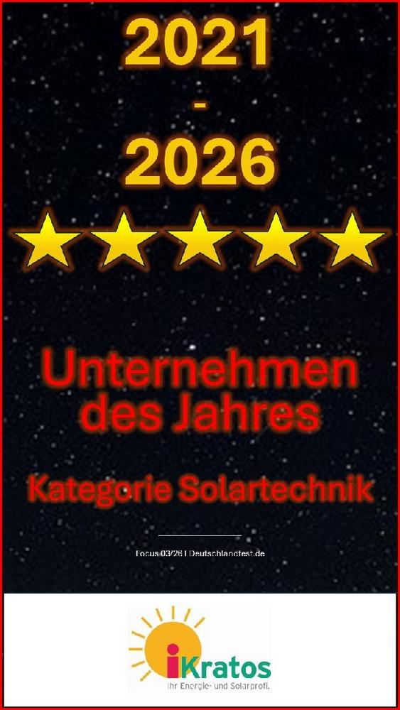 Die iKratos Solar- und Energietechnik GmbH setzt ihren Erfolgskurs fort: Zum fünften Mal in Folge wurde das Unternehmen aus der Metropolregion Nürnberg mit dem begehrten Siegel „Unternehmen des Jahres 2026“ in der Kategorie Solartechnik ausgezeichnet. Die von Focus Money und Deutschland Test initiierte Studie bestätigt damit die Ausnahmestellung des fränkischen Betriebs in einem dynamischen Marktumfeld.