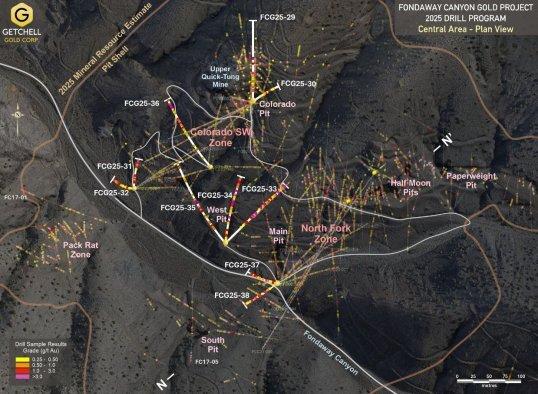 Die Bohrungen FCG25-37 und 38 wurden von derselben Bohrplattform aus am Fuße des Fondaway Canyon an der Kreuzung mit der North Fork-Verzweigung des Canyons niedergebracht (Abbildung 1). Die beiden Bohrungen wurden konzipiert, um die oberen und unteren Mineralisierungszonen in North Fork südwestlich der vorherigen Bohrungen in unterschiedlichen Ausrichtungen zu überprüfen, wobei FCG25-37 in nordwestlicher und FCG25-38 in südwestlicher Richtung niedergebracht wurde.