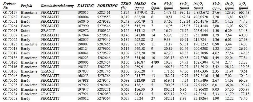 – Blanchette: Eine ausgewählte Schürfprobe aus einem Gesteinsausbiss ergab 1,82 % TREO; darin enthalten waren 3.979,41 ppm MREO (2.892,67 ppm Nd₂O₃, 935,15 ppm Pr₆O₁₁, 123,95 ppm Dy₂O₃ und 27,64 ppm Tb4O7) sowie 0,14 % Nb₂O₅.