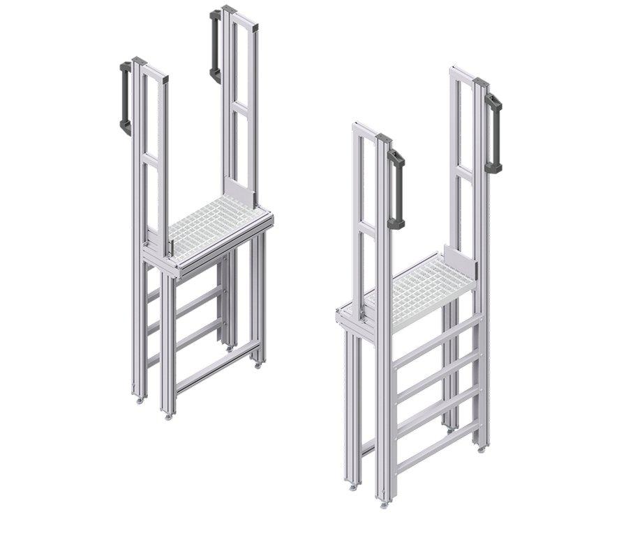 Der vertikale Aufstieg eignet sich für enge Einbausituationen, etwa an Förderbändern oder zwischen Anlagenteilen. Mit rutschhemmenden Trittflächen, einer individuellen Höhe je nach Förderband und einer Haltevorrichtung ermöglicht er einen sicheren, ergonomischen Überstieg über Förderbänder und unterstützt häufige Arbeitswege effizient.
