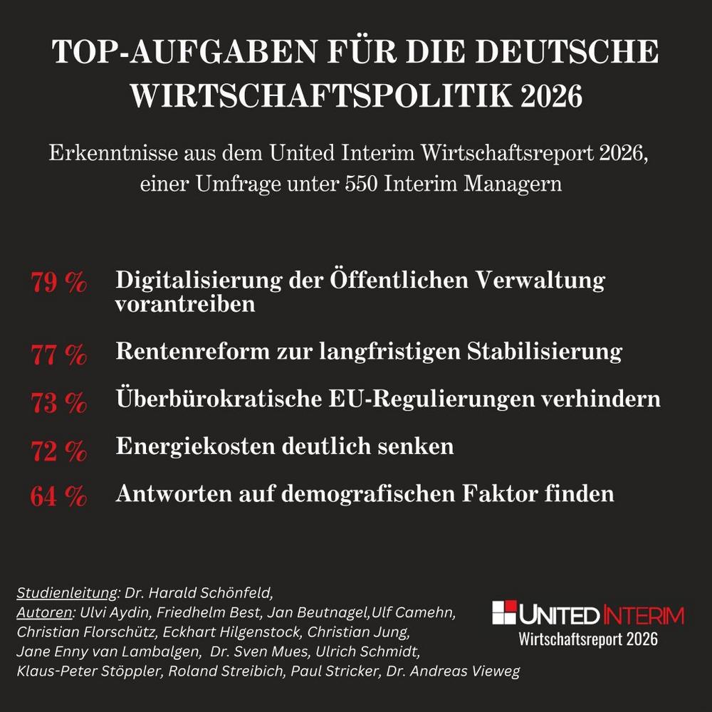 Die Digitalisierung der Öffentlichen Verwaltung, eine Rentenreform zur langfristigen Stabilisierung, der Bürokratieabbau insbesondere auf EU-Ebene und eine deutliche Senkung der Energiekosten sind die vier wichtigsten Aufgaben für die deutsche Wirtschaftspolitik 2026/27. Dies geht aus dem Wirtschaftsreport 2026 hervor, den eine Reihe renommierter Interim Manager – Ulvi Aydin, Friedhelm Best, Jan Beutnagel, Ulf Camehn, Christian Florschütz, Eckhart Hilgenstock, Christian Jung, Jane Enny van Lambalgen, Dr. Sven Mues, Ulrich Schmidt, Klaus-Peter Stöppler, Roland Streibich, Paul Stricker und Dr. Andreas Vieweg – zum Jahresbeginn vorgelegt haben. Der Report stützt sich auf eine Umfrage unter 550 Führungskräften auf Zeit, durchgeführt von der Management-Community United Interim (www.unitedinterim.com).