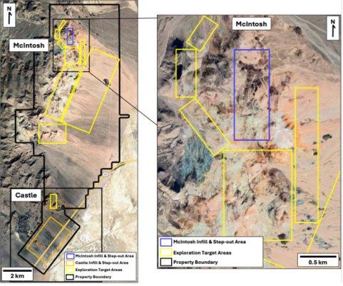 Das erweiterte Programm dient sowohl der weiteren Erschließung als auch der flächenmäßigen Ausdehnung der bekannten Mineralisierung in den Zonen McIntosh und Castle, wobei etwa zwei Drittel des für die Bohrungen veranschlagten Budgets für die zielgerichtete Exploration zur Entdeckung neuer Mineralisierungszonen vorgesehen sind. Zu den Zielgebieten zählen die trendbegleitenden und südlichen Ausläufer der Zone McIntosh sowie mehrere vielversprechende geophysikalische Ziele innerhalb der Projektzonen Range und Pediment (siehe Karte oben).