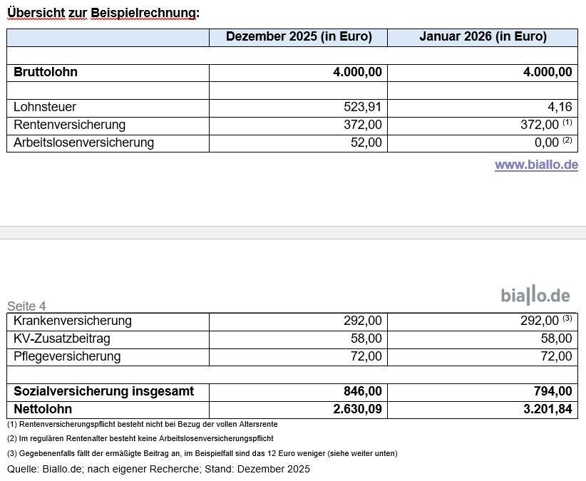 Beispiel: Elvin S., Jahrgang 1959, feierte im Oktober 2025 seinen 66. Geburtstag. Anfang Dezember hat er sein reguläres Rentenalter von 66 Jahren und zwei Monaten erreicht. Er verdient monatlich brutto 4.000 Euro. Mit seinem Arbeitgeber hat er eine unveränderte Weiterarbeit im kommenden Jahr vereinbart. Im Januar 2026 „explodiert“ sein Nettogehalt durch den neuen Aktivrenten-Freibetrag. Statt 2.630 Euro netto im Dezember stehen dann auf seinem Lohnzettel 3.202 Euro. Ein Plus von 572 Euro. Der Grund: Es fallen nur noch vier Euro Lohnsteuer an, im Dezember 2025 sind es noch 524 Euro. Gerechnet haben wir hier mit Steuerklasse I oder IV und unterstellt, dass Elvin S. nicht kinderlos ist und Rentenversicherungsbeiträge zahlt.