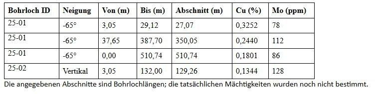 Bohrloch 25-01 erreichte eine Gesamttiefe von 510,74 m und ergab über seine gesamte Länge einen gewichteten Durchschnittsgehalt von 0,1801 % Kupfer und 86 ppm Molybdän. Die niedriggradigere Mineralisierung setzt sich über das Ende des Bohrlochs hinaus fort, was darauf hinweist, dass das System in der Tiefe weiterhin offen ist.