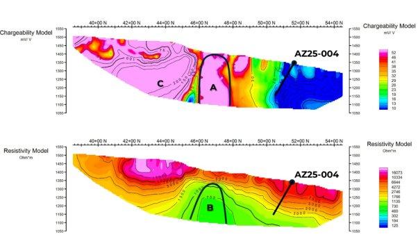 Die ergiebigsten Bodenproben ergaben Werte von bis zu 2.210 ppm Cu, bis zu 248 ppm Mo und bis zu 1,14 g/t Au, während geophysikalische Daten zusätzliche Vektoren liefern, die bei der Priorisierung der Bohrziele helfen. Diese Ergebnisse ergänzen frühere Bohrungen an anderen Stellen der Liegenschaft, darunter 14,4 m mit 0,44 % Cu (einschließlich 0,9 m mit 2,10 % Cu und 1,5 m mit 0,37 g/t Au) in Bohrloch AZ25-001, und rechtfertigen eine weitere Verfeinerung der Ziele und Folgeexplorationen.