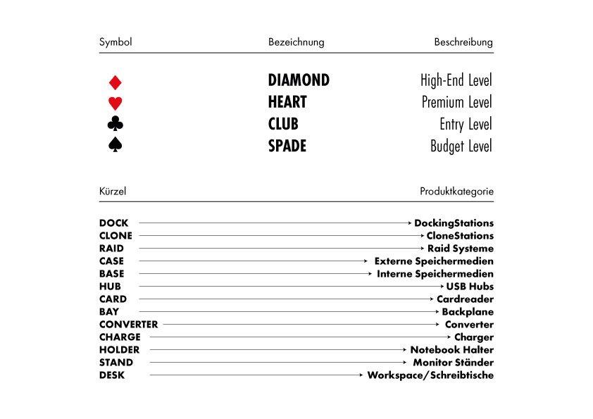 Die Produktkategorien äußern sich durch individuelle Namen. So heißen DockingStations zusätzlich "Dock", Kartenleser zusätzlich "Card", RAID-Systeme "Raid" und so weiter.