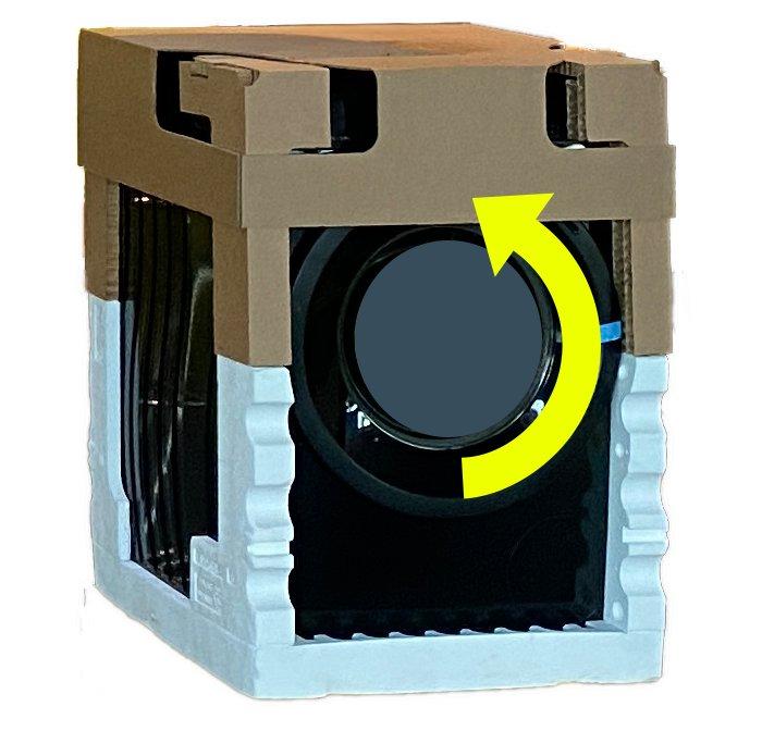 Zum Einsatz kommen formstabile Wabenelemente, die gezielt an hochbelasteten Stellen positioniert sind. Hochverdichtete Kantenschutzelemente, eine flächige Lastverteilung sowie die Fixierung des Geräts ohne zusätzliche Kunststoff- oder Styroporelemente sorgen für einen sicheren Transport.