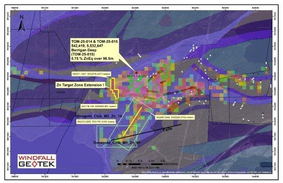 KI von Windfall Geotek validiert bedeutende Entdeckung: TomaGold durchteuft in der Entdeckung Berrigan Deep 5,75 % ZnÄq auf 98,5 Meter